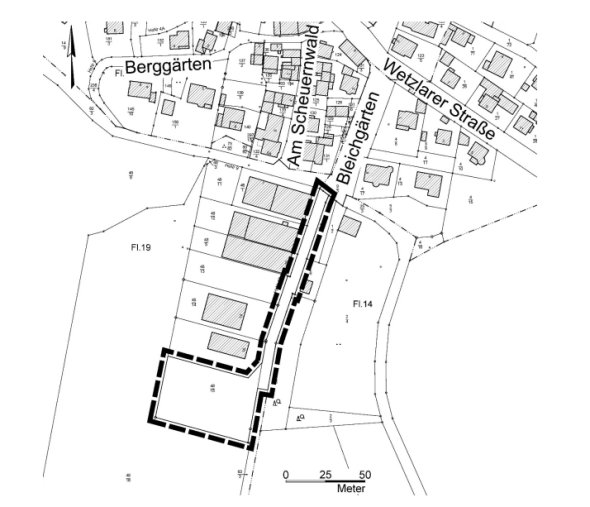In den Geltungsbereich wurde auch die Parzelle der Straße „Bleichgärten“ ab dem Grundstück „Bleichgärten Nr. 7“ in Richtung Süden bis auf Höhe des geplanten Gewerbegrundstückes aufgenommen.
