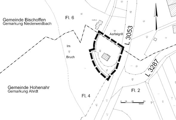 Der nördlich gelegene Geltungsbereich verläuft südlich der B255 auf einer Länge von etwa 230 m und im Abstand von mind.10 m. Er grenzt im Osten an die Gemarkung Niederweidbach der Gemeinde Bischoffen an und liegt im seit 1992 rechtskräftigen Bebauungsplan.